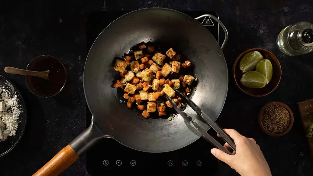 Tofu in Speisestärke wenden, überschüssige Stärke abschütteln. Süßkartoffelwürfel in eine Schüssel geben, den Wok mit Küchenpapier auswischen. Rapsöl erhitzen, den Tofu darin 5 Min. goldbraun braten.