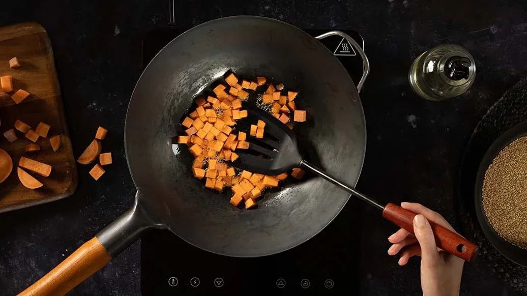 Süßkartoffel gründlich waschen. In 1 cm große Würfel schneiden und mit dem Rapsöl in einem Wok mit Deckel bei mittlerer Hitze etwa 10 Min. braten.