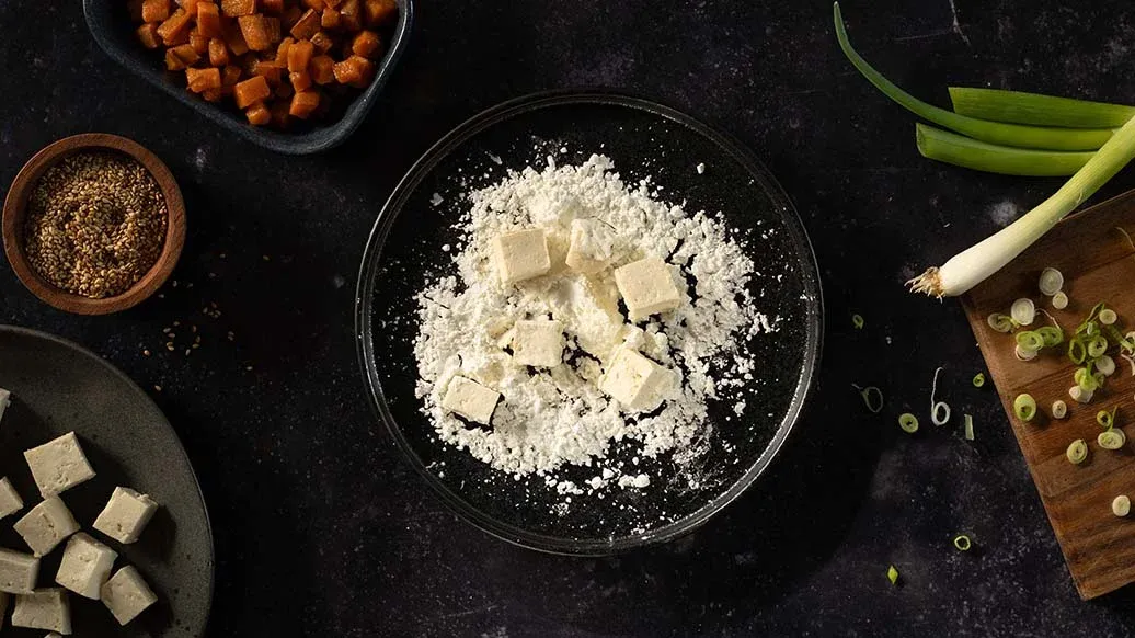 Ein japanischer Klassiker mit einem kleinen pflanzenbasierten Gemüse-Twist: Der knusprige Sesam-Tofu und cremige Süßkartoffeln ergeben ein wunderbares Zusammenspiel unterschiedlicher Texturen, sodass jeder Bissen sowohl crunchy als auch creamy ist.