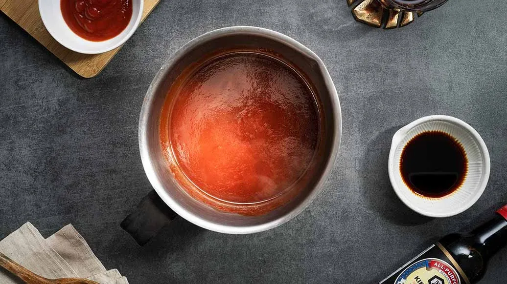 3 EL Rotwein – 3 EL Ketchup – 2 EL Worcestershire-Sauce – 1 EL Kikkoman natürlich gebraute Sojasauce – 1 EL Zucker