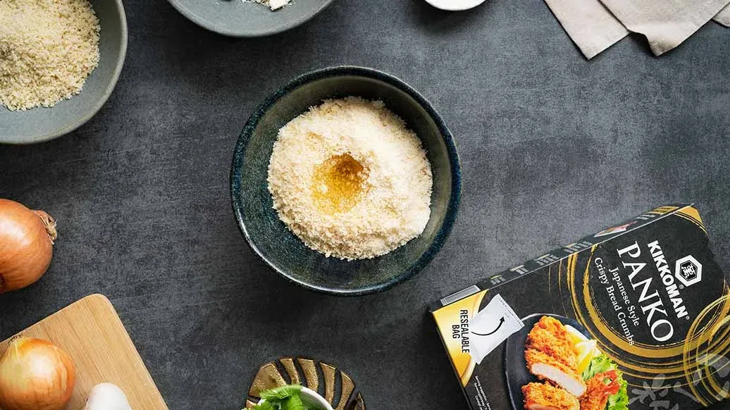 90 g Kikkoman Panko - Knuspriges Paniermehl nach japanischer Art – 2 EL Geriebener Parmesan – 2 EL Olivenöl