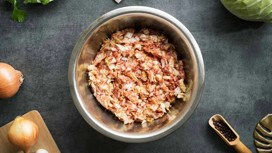 250 g Rinderhackfleisch – 250 g Weißkohl, in 1 cm große Würfel geschnitten – ½ Zwiebel, in 1 cm große Würfel geschnitten – 6 EL Kikkoman Panko - Knuspriges Paniermehl nach japanischer Art – 2 Eier – 2 EL Kikkoman natürlich gebraute Sojasauce – 1 TL schwarzer Pfeffer
