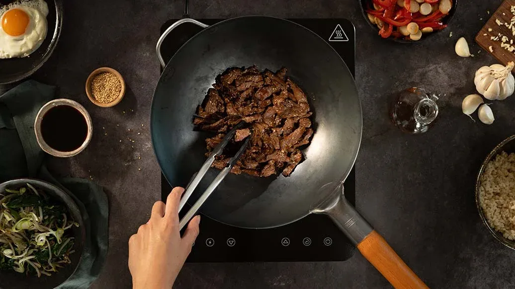 Für mehrere Personen kannst du die Gemüsevielfalt noch erhöhen. In Korea kommen zum Beispiel oft auch Gurken, Karotten oder regionale Zutaten wie die getrockneten Wurzeln der Ballonblume oder Farnsprossen mit dazu. Wird das fertige Bibimbap in einem Steintopf, dem „Dolsot“, erhitzt, kann man auch rohe Eigelbe anstelle der Spiegeleier verwenden. Sowohl beim klassischen Bibimbap als auch bei der Dolsot-Variante werden alle Zutaten erst beim Essen verrührt. Im Steintopf garen dann Eigelb und auch das marinierte Rinderfilet nur leicht im heißen Reis und Gemüse.