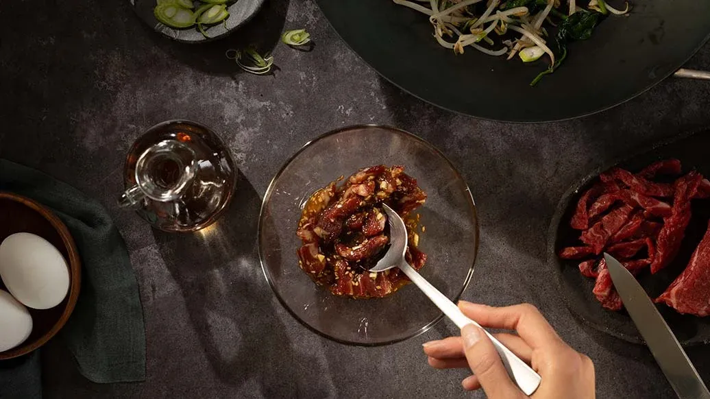 Rindfleisch kurz mit Kikkoman Teriyaki BBQ Sauce Korean Style, Knoblauch, Kikkoman Sesamöl und Sesam marinieren. Dann das Rindfleisch im heißen Öl unter Rühren braten, bis es gar ist.
