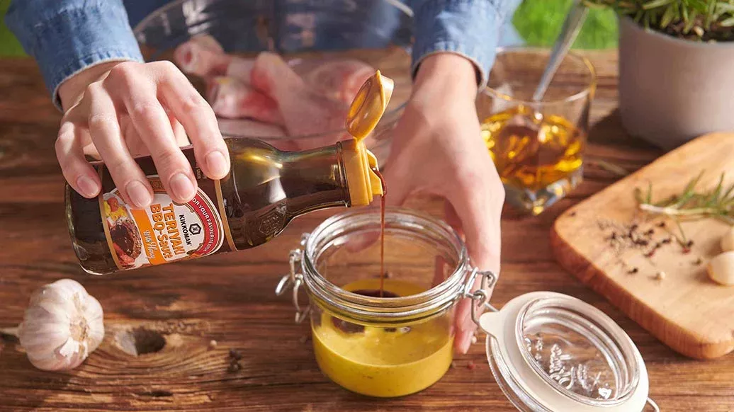 3 Knoblauchzehen – 3 EL Tafelsenf – 4 EL Kikkoman Teriyaki Barbecuesauce Honig – ½ EL Honig (oder brauner Zucker) – 4 EL Whisky – 1 Prise Pfeffer
