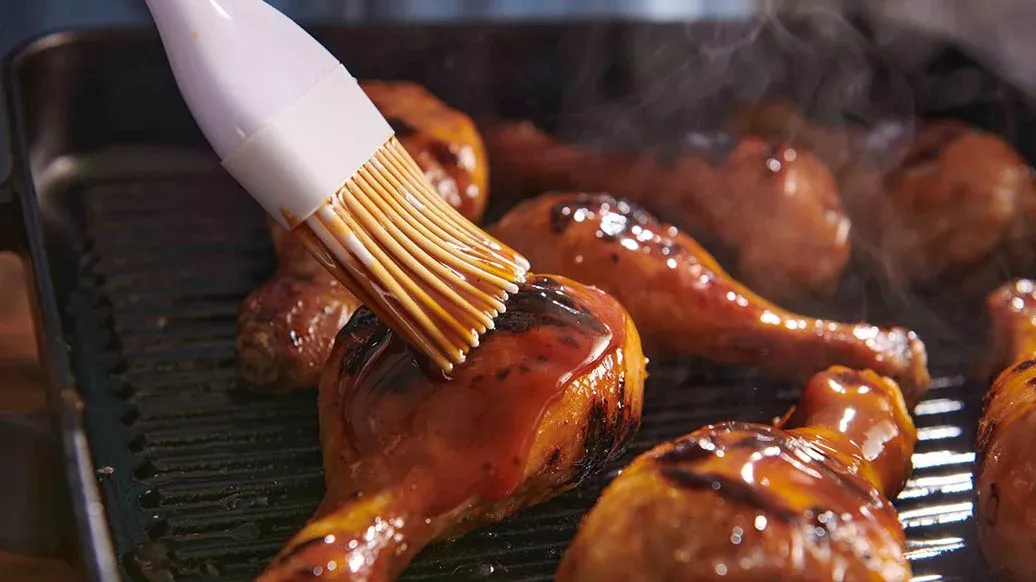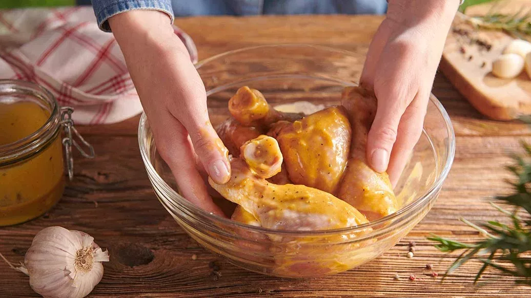 Die Hähnchenkeulen gründlich mit der vorbereiteten Marinade bestreichen und für mindestens 2 Stunden in den Kühlschrank stellen.