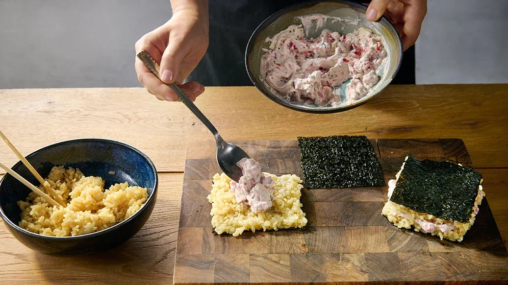 Eine köstliche, süße Leckerei: Erdbeer-Mascarpone-Onigirazu, mit Reis und knusprigen Pistazien gefüllt und von Seetang umhüllt. Die Zubereitung macht genauso viel Spaß wie das Genießen.