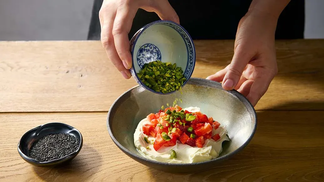 Erdbeeren und Pistazien fein hacken und mit Mascarpone und Sesam vermengen.