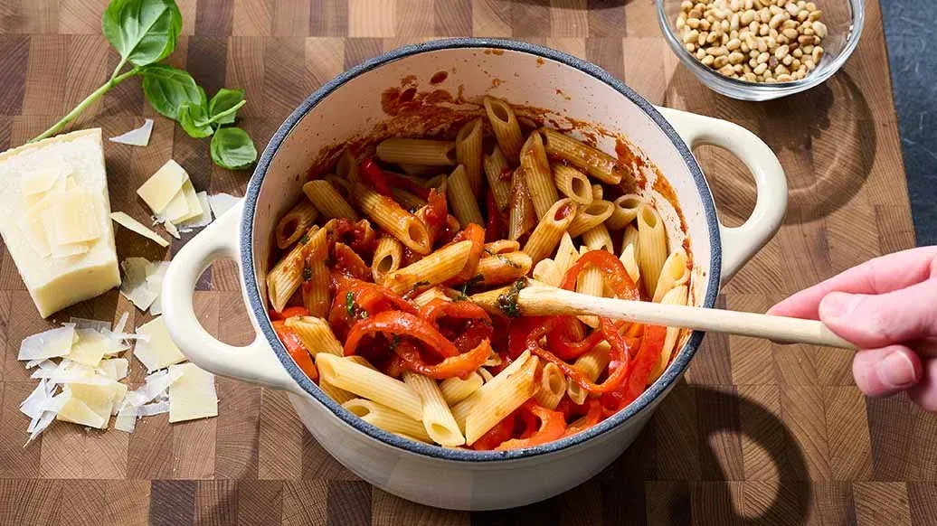Die Pasta mit der Sauce, den Ofenpaprika und dem aufgefangenen Nudelwasser vermischen und auf Tellern anrichten. Mit den Ofentomaten, dem übrigen Basilikum und den Pinienkernen garnieren, den Parmesan frisch darüber hobeln und servieren.