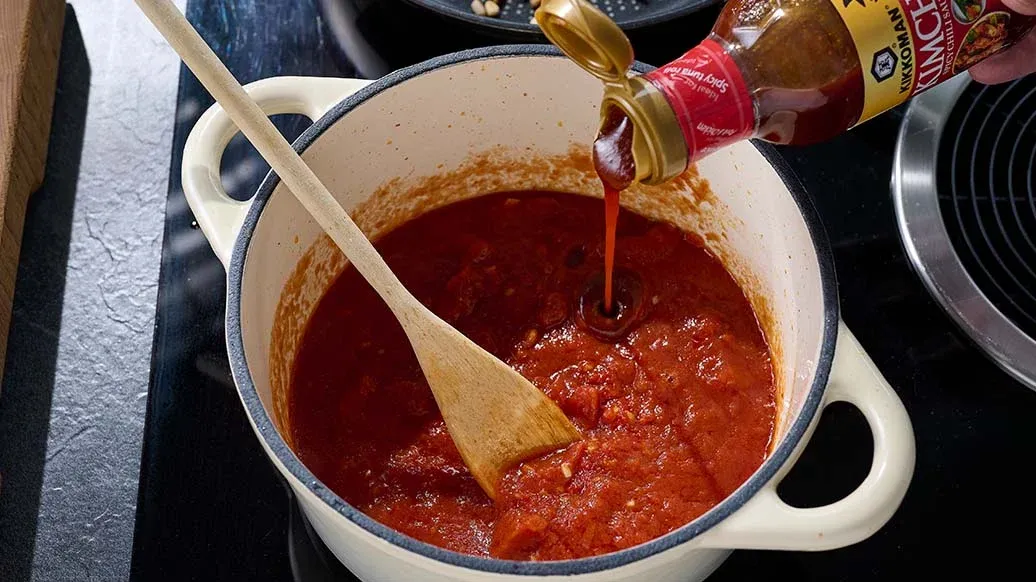 2 Knoblauchzehen – 3 EL Tomatenmark – 1 EL Olivenöl – 2 TL Kikkoman scharfe Chilisauce für Kimchi – 600 g stückige Tomaten (aus der Dose) – 1 TL brauner Zucker (alternativ: Kikkoman süße Würzsauce zum Kochen nach Mirin-Art) – 40 g Pinienkerne