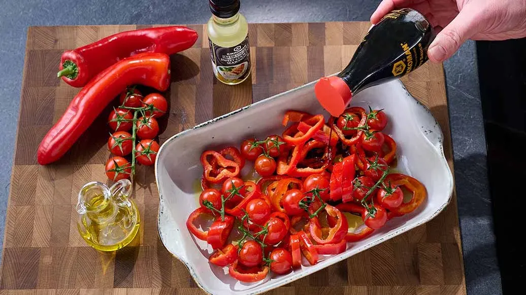 Den Backofen auf 200 °C vorheizen. Paprika in Ringe schneiden, mit Tomaten, Öl, Zucker und Kikkoman Sojasauce vermischen, in einer kleinen Auflaufform verteilen und im Backofen 10 bis 15 Min. garen (die Tomaten dürfen dabei ruhig aufplatzen).
