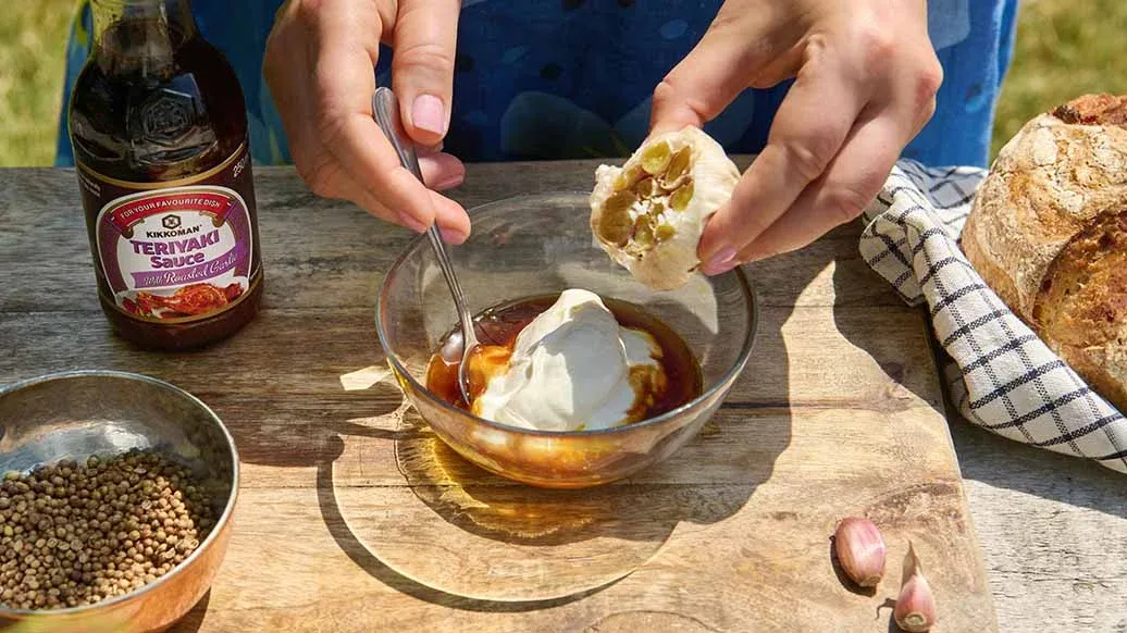 Den Backofen auf 200 °C vorheizen. Die Spitze der Knoblauchknolle abschneiden und mit dem Olivenöl und einer Prise Salz beträufeln. In Alufolie gewickelt 30 bis 40 Minuten rösten, bis der Knoblauch goldbraun und weich ist. Nach dem Abkühlen die Knoblauchzehen aus der Haut pressen und zerdrücken. Kikkoman Teriyaki Sauce mit Knoblauch und den Joghurt untermischen.