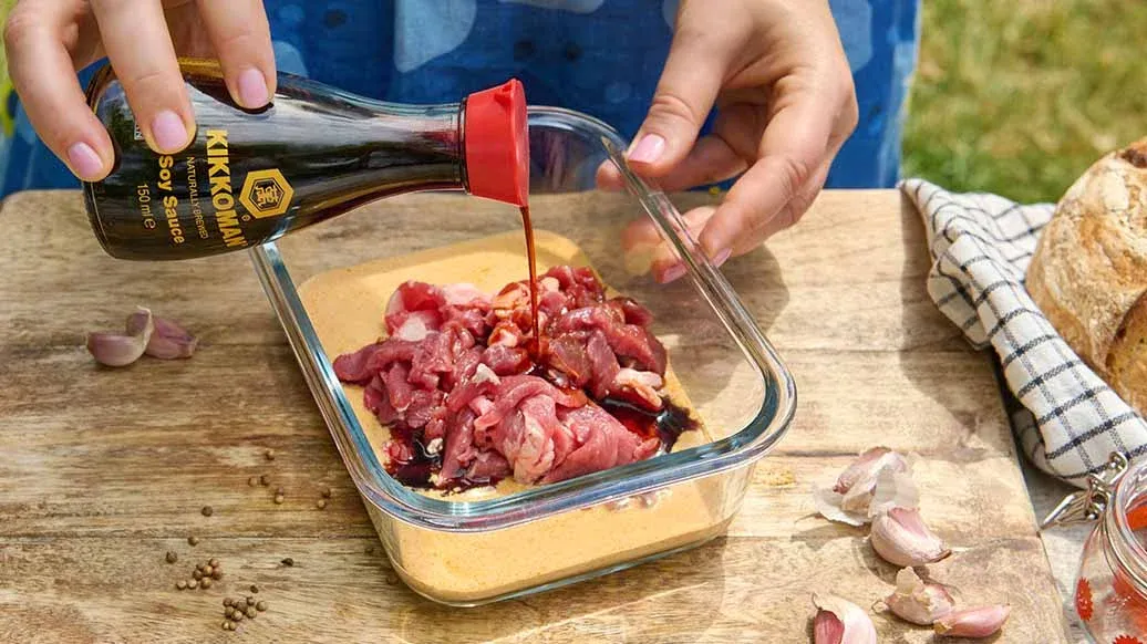 200 g Lammschulter, in dünnen Scheiben – 2 Knoblauchzehen, gehackt – 2 EL Naturjoghurt – 1 EL Zitronensaft – 1 EL Olivenöl – 1 TL gemahlener Kreuzkümmel – 1 TL Paprikapulver – ½ TL gemahlener Koriander – ½ TL gemahlener Zimt – 4 EL Kikkoman natürlich gebraute Sojasauce