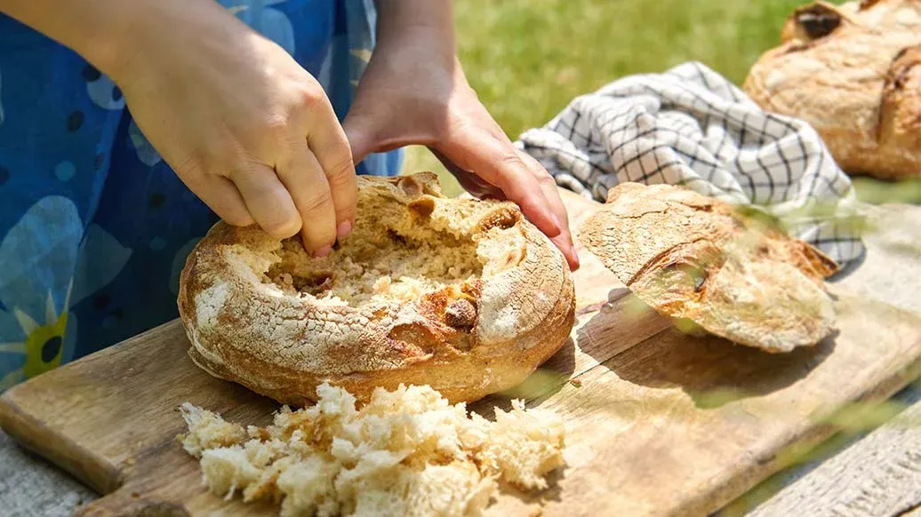 Dieses Picknickbrot kombiniert Shawarma vom marinierten Lamm, Spinat und Nüsse in knusprigem Brot, das mit gerösteter Knoblauchsauce getoppt wird.