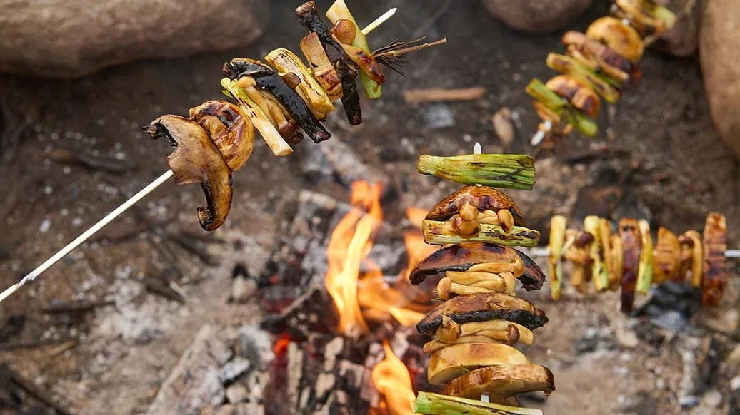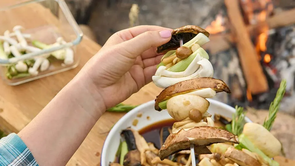 Die Pilze und den Lauch aus der Marinade nehmen und abwechselnd auf Spieße stecken. Die restliche Marinade aufbewahren.