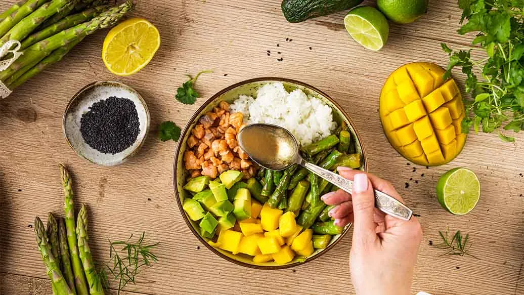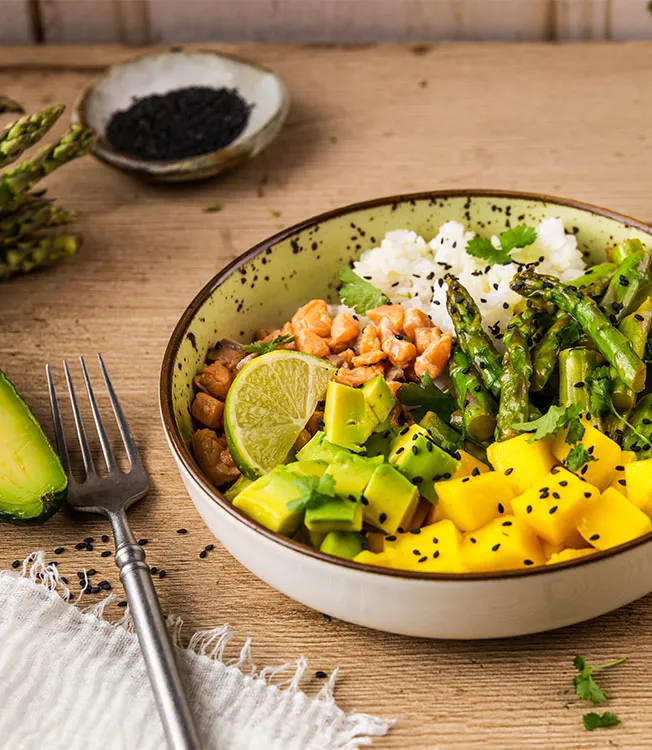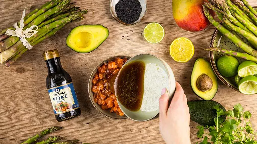 Eine leichte, frische Bowl, inspiriert von der hawaiianischen Küche. In Limettensaft und Kikkoman Sauce für Poke Bowls marinierter Lachs, serviert mit knackigem grünem Spargel und Sushi-Reis. Mango und Avocado sorgen für Ausgewogenheit und Farbe.