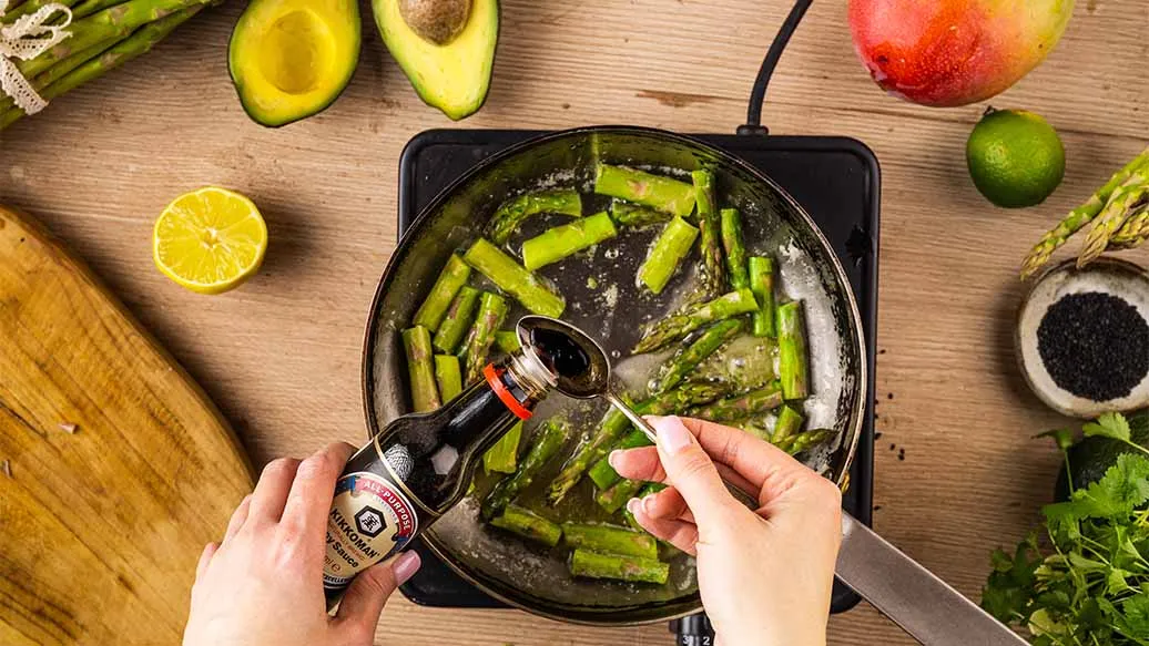 Spargel waschen, holzige Enden abbrechen und in 3–4 cm lange Stücke schneiden. Butter und Olivenöl in einer Pfanne erhitzen, den Spargel hinzufügen und unter häufigem Rühren 2–3 Minuten anbraten. Zitronensaft und Kikkoman Sojasauce zugeben, vermischen und ca. 1 Minute weitergaren. Beiseitestellen.