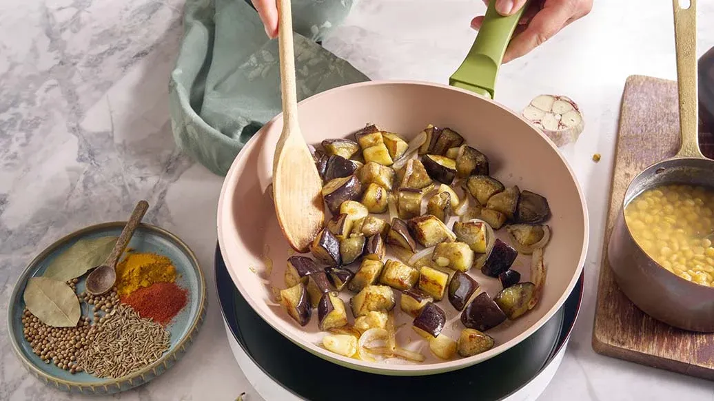 Oberseite der Knoblauchknolle abschneiden, damit die Zehen freiliegen. Mit Öl bestreichen und etwa 30 Minuten bei 180 °C im Ofen backen. Chana Dal 40 Minuten in Gemüsebrühe kochen. Zwiebel und Aubergine in einer Pfanne 5 Minuten in Ghee anbraten, bis sie goldbraun sind, dann den gerösteten Knoblauch hinzufügen. Kreuzkümmel, Kurkuma, Koriandersamen, Paprikapulver und Lorbeerblatt zugeben und 10 bis 15 Sekunden anbraten, damit sich die Aromen entfalten können.