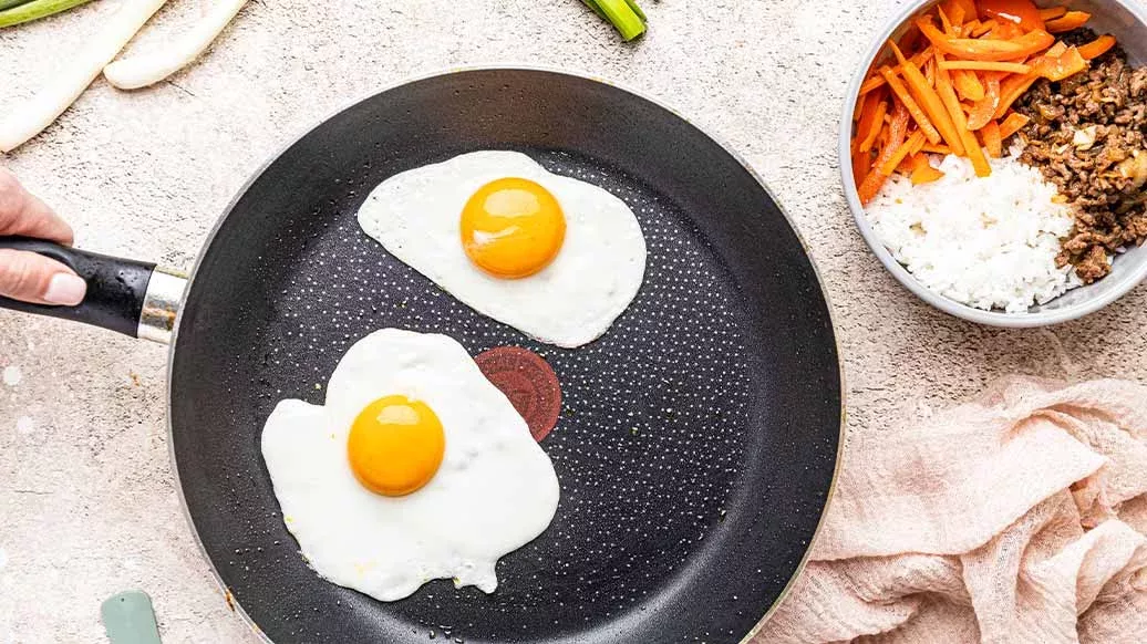 Die Eier braten, bis das Eiweiß stockt und das Eigelb noch flüssig ist.
