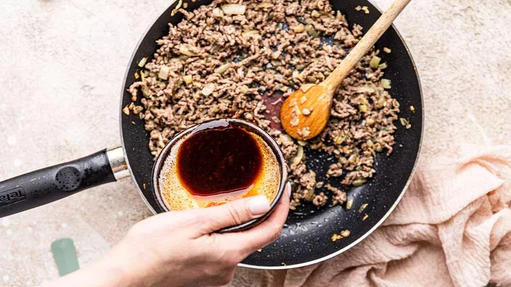 2 EL Frittieröl – 1 Zwiebel – 1 Knoblauchzehe – ½ TL gemahlener Ingwer – 200 g Rinderhackfleisch – 2 EL Kikkoman natürlich gebraute Sojasauce – 50 ml Sriracha