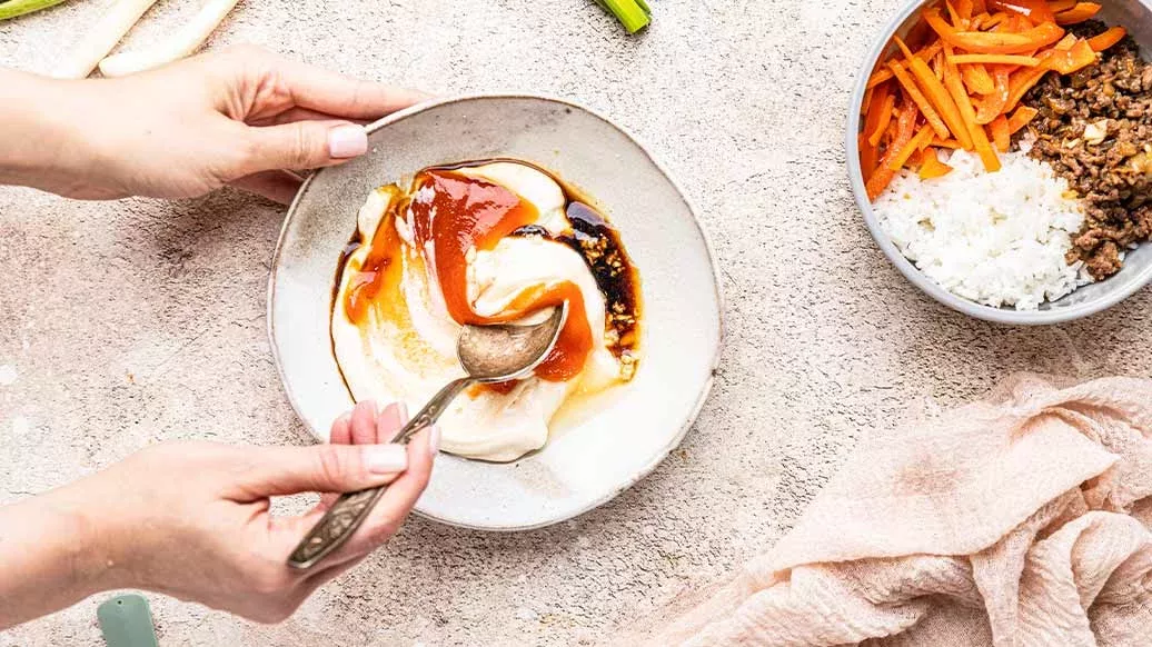 Den gekochten Reis ebenfalls in die Schüsseln füllen. Die gehackte Gurke und die zwei Spiegeleier in die Schüsseln geben und mit den Frühlingszwiebeln bestreuen. Jeweils mit der Hälfte der Mayonnaise-Sriracha-Sauce servieren.