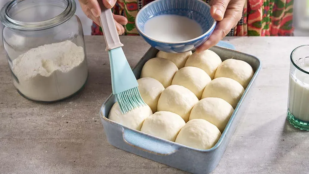 120 ml Milch auf 38 °C erwärmen und mit Zucker und Hefe vermischen. Nach und nach mit 170 g Mehl zu einem Teig verarbeiten. 5 g Butter schmelzen, hinzufügen und nochmal ca. 10 Minuten kneten. In 12 Kugeln teilen und in eine Backform legen, die mit den restlichen 10 g geschmolzener Butter bestrichen wurde. Abdecken und 40 Minuten gehen lassen. Dann die Oberseiten gründlich mit den restlichen 20 ml Milch bestreichen und bei 180 °C 20 Minuten backen, bis die Oberseiten goldbraun sind. Das Dal mit den Pav-Brötchen servieren und mit Chili garnieren.