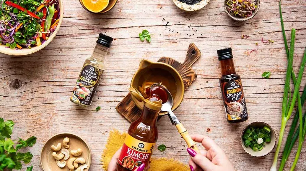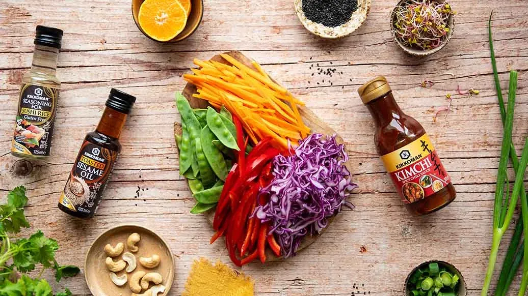 1 EL Kikkoman scharfe Chilisauce für Kimchi – 1 EL frisch gepresster Orangensaft – 1 EL Erdnussbutter – 1 EL Kikkoman geröstetes Sesamöl – 1 TL Ahornsirup – 1 TL Kikkoman Würzmittel für Sushi-Reis (125ml) – ½ EL Wasser – 20 g Cashewkerne – 2 TL schwarzer Sesam