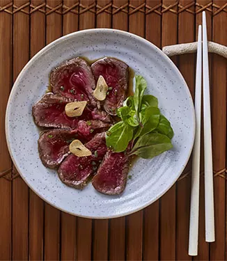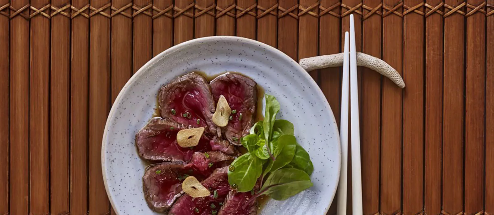 Das Rinderfilet in 4-5 cm lange Stücke schneiden. Das Fleisch von jeder Seite anbraten. In Aluminiumfolie einwickeln und nachziehen lassen. Den Knoblauch in Scheiben schneiden und knusprig rösten. Den Schnittlauch fein schneiden. Jetzt das Fleisch aufschneiden und anrichten. Mit Kikkoman Sauce für Reis übergießen und mit den Knoblauch-Chips und dem Schnittlauch garnieren.