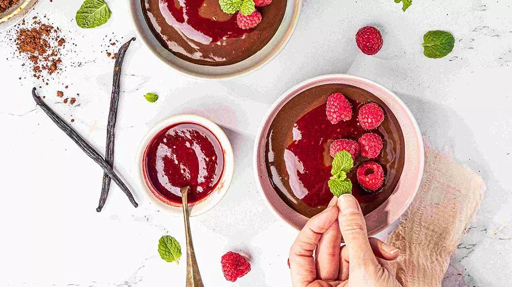 Den Pudding in kleine Schüsseln füllen. Die Himbeersauce darübergießen und mit frischer Minze und Himbeeren garnieren.