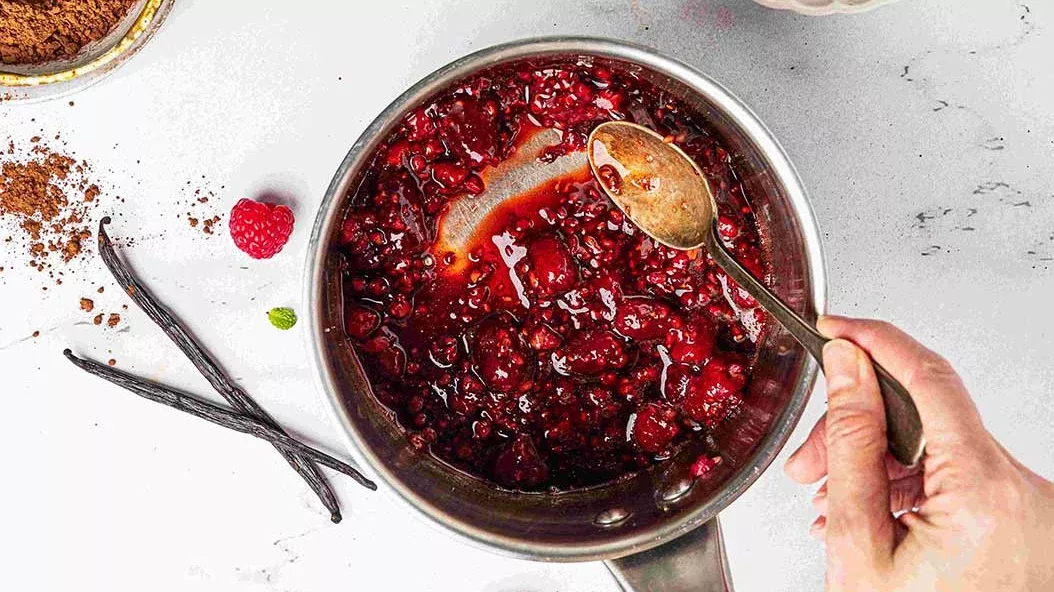 Himbeeren, Zucker und Kikkoman glutenfreie Sojasauce in einen Topf geben und erhitzen, bis die Himbeeren anfangen zu zerfallen. Danach die Früchte durch ein Sieb streichen.