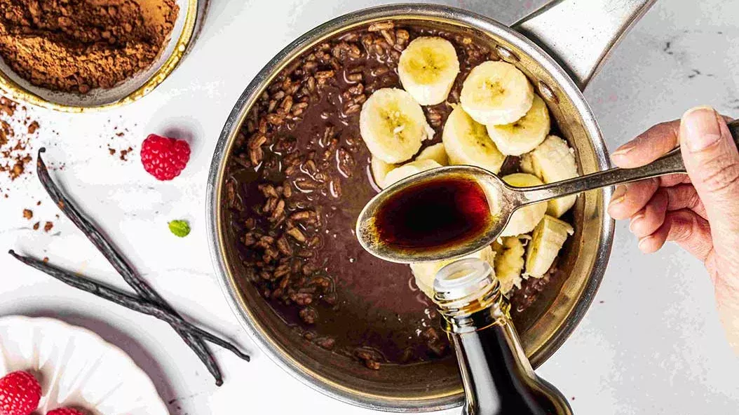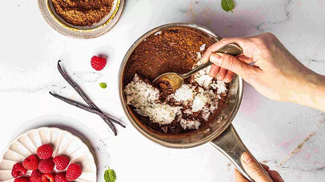 Die Milch mit dem Kakao und dem Vanilleextrakt erhitzen. Den Reis hinzufügen und erwärmen.
