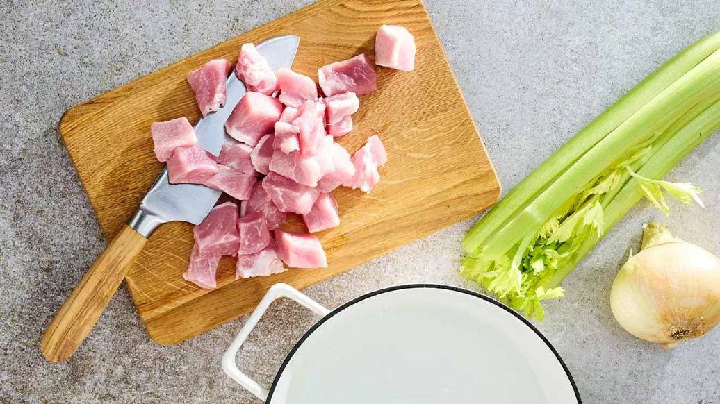 Das Schweinefleisch in einen Topf geben und mit Wasser bedecken. Bei starker Hitze zum Kochen bringen und dann das Schweinefleisch sofort herausnehmen.