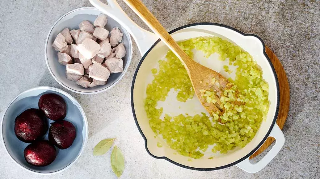 Schweinefleisch, Rote Bete, Lorbeerblätter, Kikkoman Ponzu Yuzu und Wasser in einen tiefen Topf geben und zugedeckt 1 Stunde köcheln lassen. Mit Kikkoman Sojasauce und schwarzem Pfeffer würzen sowie mit etwas Petersilie garnieren