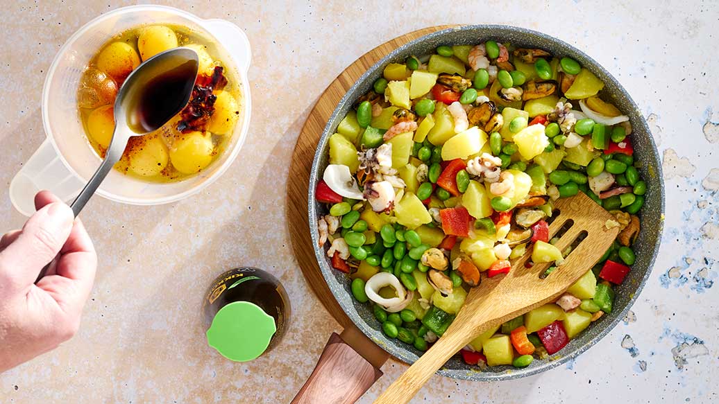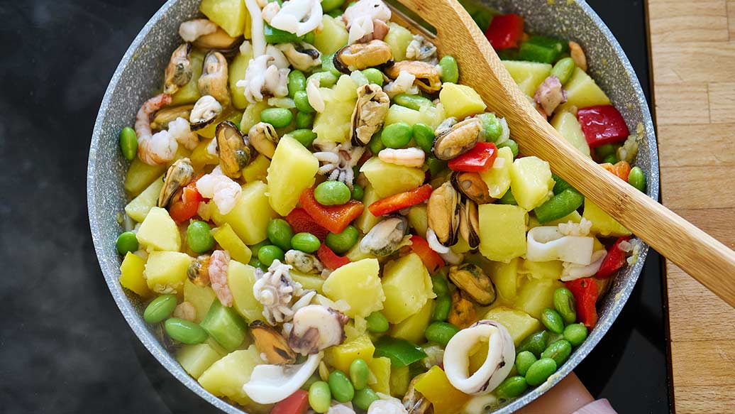 3 EL Pflanzenöl – 400 g vorgegarte Kartoffelwürfel – 200 g bunte Paprikawürfel – 1 fein gewürfelte Zwiebel – 1 gepresste Knoblauchzehe – 250 g aufgetaute Meeresfrüchte – 150 g Edamame ohne Schale