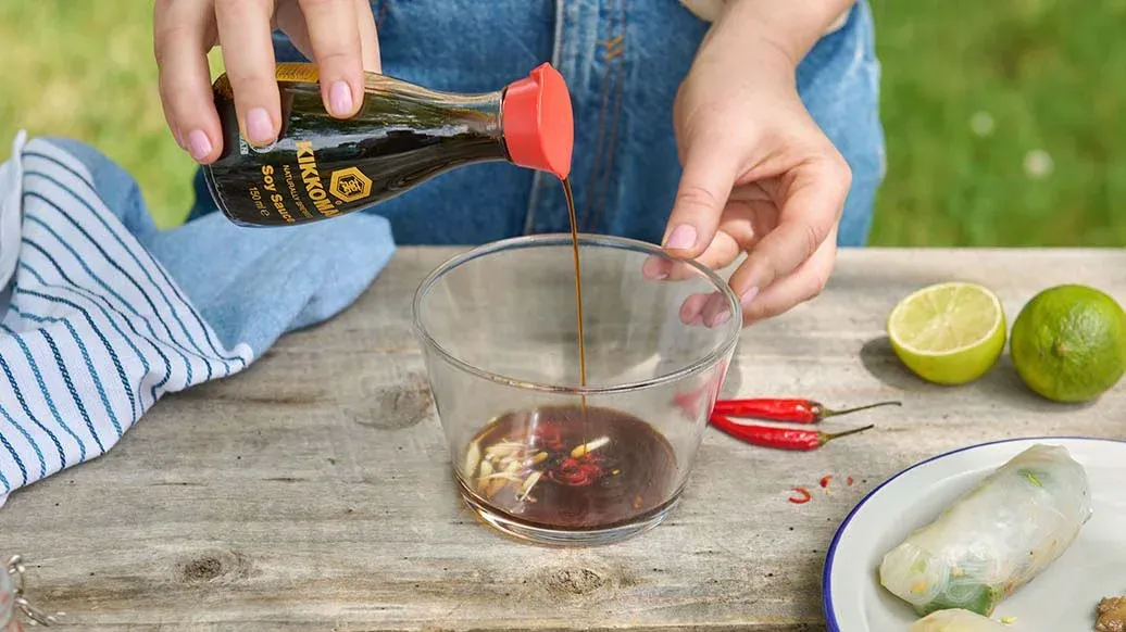 In einer kleinen Schüssel Kikkoman Sojasauce, Limettensaft, Zucker, Knoblauch und Chili verquirlen, bis sich der Zucker auflöst. Zu den Sommerrollen servieren.