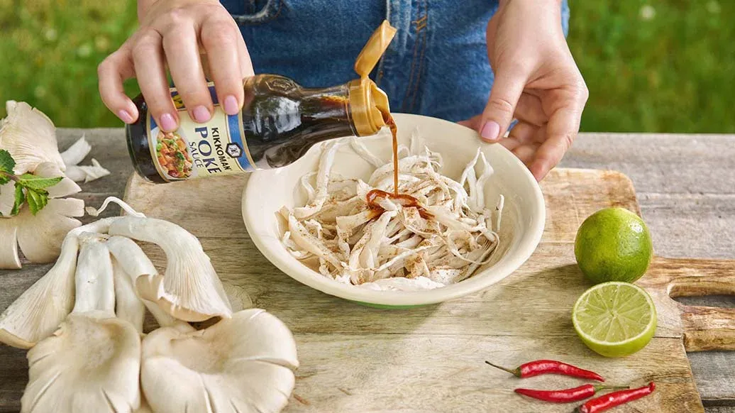 200 g Königsausternpilze, gezupft – 40 ml Kikkoman Sauce für Poke-Fischsalat auf Basis von Sojasauce und Sesamöl – 1 g Fünf-Gewürze-Pulver – 1 EL Speiseöl