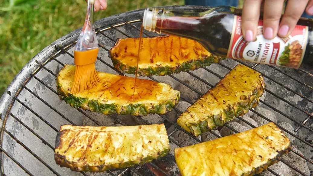 Die Ananas in größere Stücke schneiden. Mit Kikkoman Teriyaki Marinade bestreichen und auf einem sehr heißen Grill kurz grillen. Dann schälen und in Würfel schneiden.