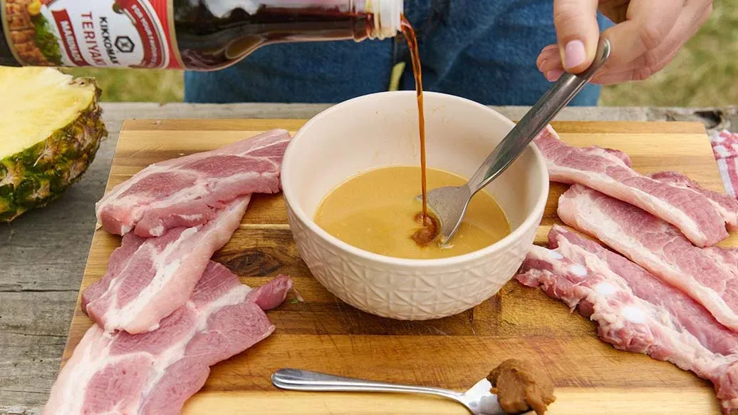 500 g roher Speck, in Scheiben – 90 ml Kikkoman Teriyaki Marinade – 1 EL Miso-Paste – 4 EL Ananassaft – 4 EL Mirin-Wein