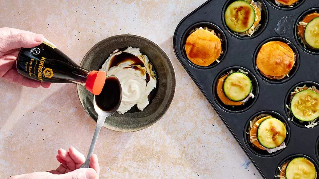 Kleine Süßkartoffel-Türmchen mit würzigem Bacon, Zucchini, geschmolzenem Käse und aromatischer Kikkoman Teriyaki Barbecuesauce Honig. Dazu ein cremiger Frischkäse-Dip – perfekt fürs Picknick!