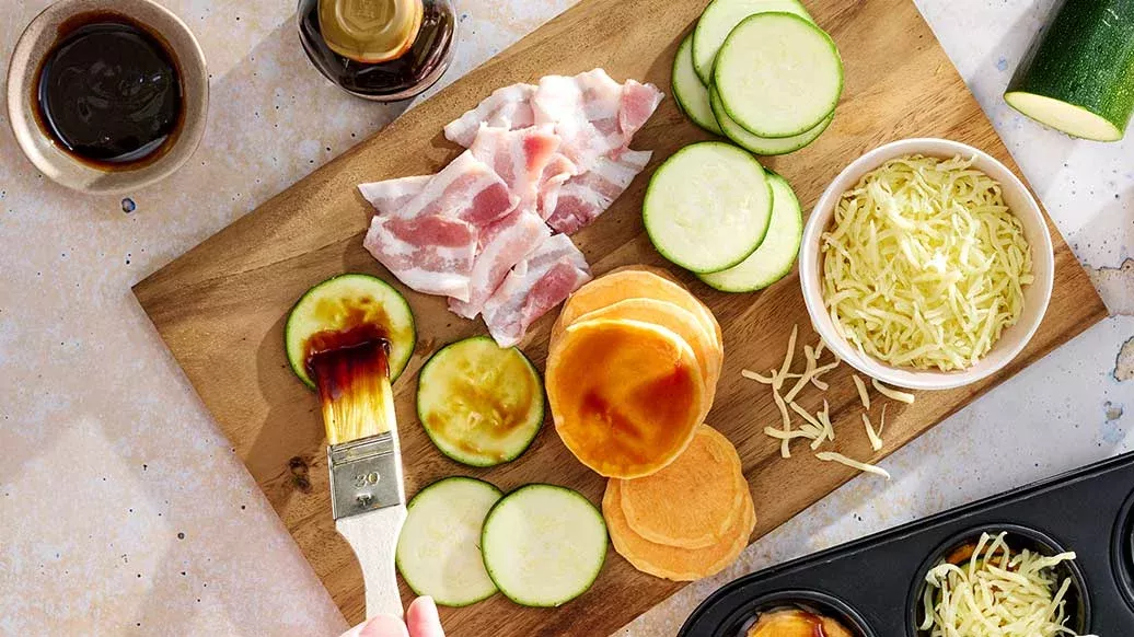 1 EL Pflanzenöl – 300 g Süßkartoffeln – 200 g Zucchini – 4 EL Kikkoman Teriyaki Barbecuesauce Honig – 100 g Bacon in Scheiben – 100 g geriebener Gouda
