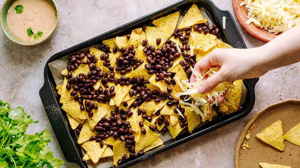 Die Nachos auf einem mit Backpapier ausgelegten Backblech verteilen. Mit Gewürzen, Bohnen und Käse bestreuen. Etwa 5 Minuten überbacken, bis der Käse schmilzt.