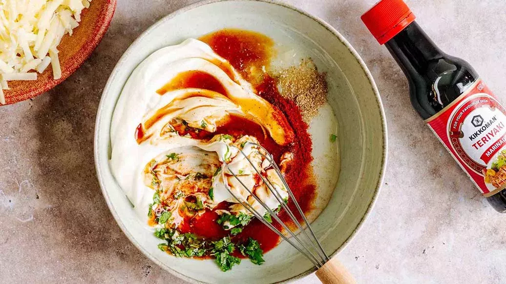 3 EL Mayonnaise – 1 EL Kikkoman Teriyaki Marinade – 1 TL Sriracha-Sauce – 2 EL Limettensaft – 1 EL Agavendicksaft – 1 TL Paprikapulver, geräuchert – ½ TL gemahlener Kreuzkümmel – ½ TL gemahlener Koriander – 1 EL gehackter frischer Koriander