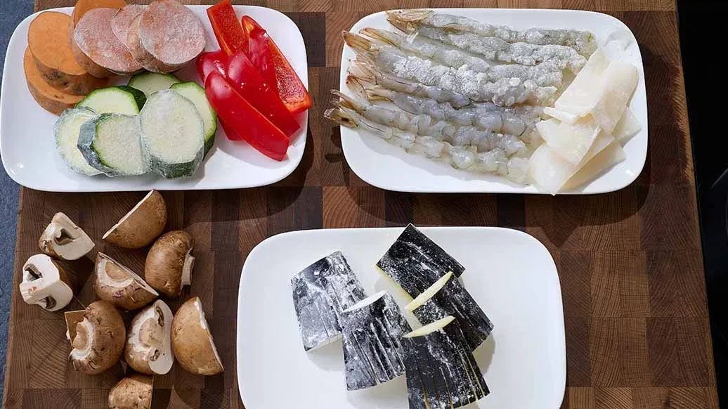 Tintenfischfilets in 2 x 4 cm große Stücke schneiden. Garnelen trocken tupfen. Shiitake-Pilze halbieren. Paprika in 2 x 4 cm große Stücke, Zucchini und Süßkartoffel in ca. 8 mm dünne Scheiben schneiden. Aubergine in knapp 1 cm dicke Scheiben schneiden.