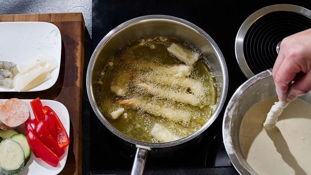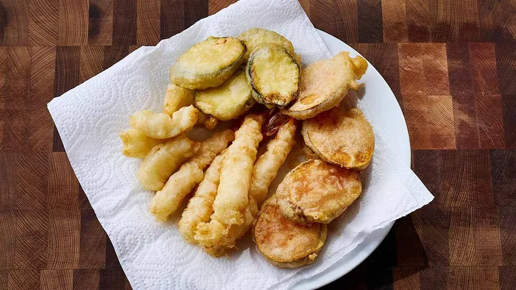 Alle Zutaten mit dem Mehl bestäuben, abschütteln, in den Tempura-Teig tauchen und in Öl bei ca. 170 °C goldbraun ausbacken. Auf Küchenpapier abtropfen lassen.