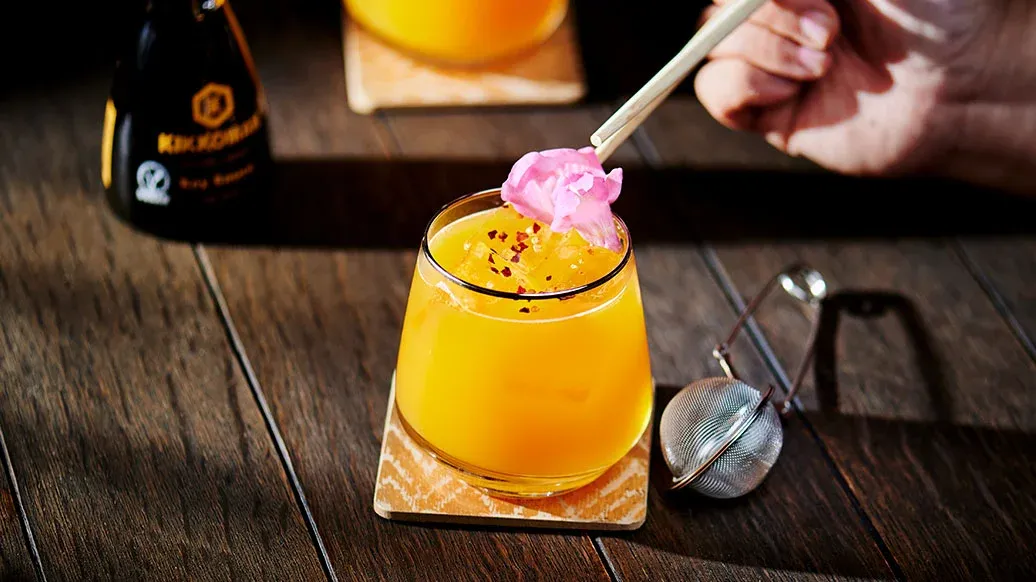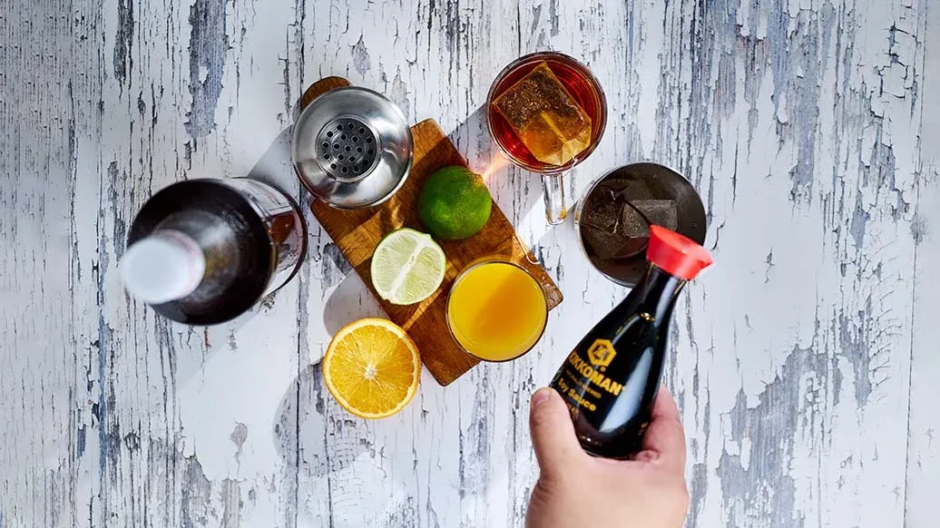 120 ml Mandarinensaft – 80 ml Limettensaft – 40 ml Kürbisgewürzsirup – 2 Spritzer Kikkoman natürlich gebraute Sojasauce – 200 ml kalter Rooibos-Vanille-Tee – 16 Eiswürfel (à ca. 20 g)