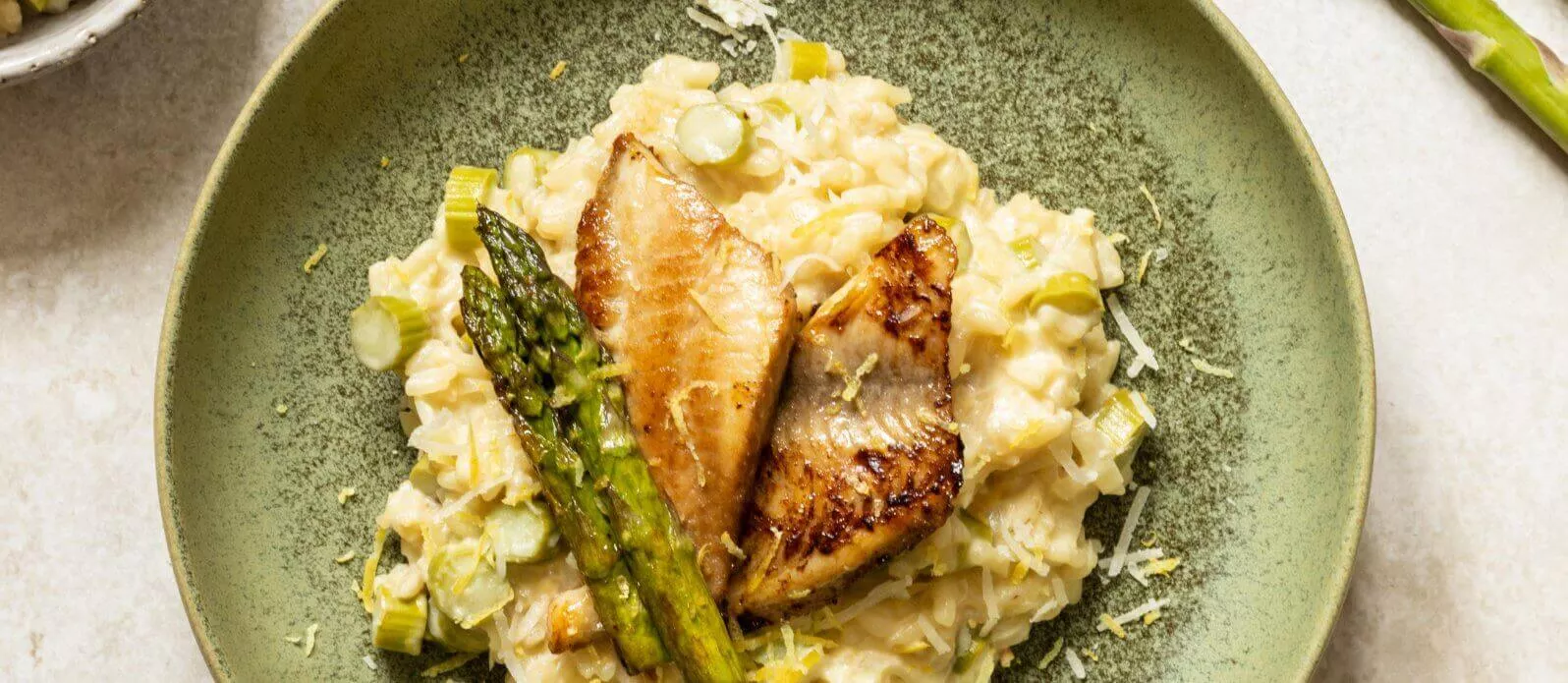 Cremiges Risotto mit einer spritzigen Zitronennote, das wunderbar zu Spargel und knusprigem Tilapia passt.
