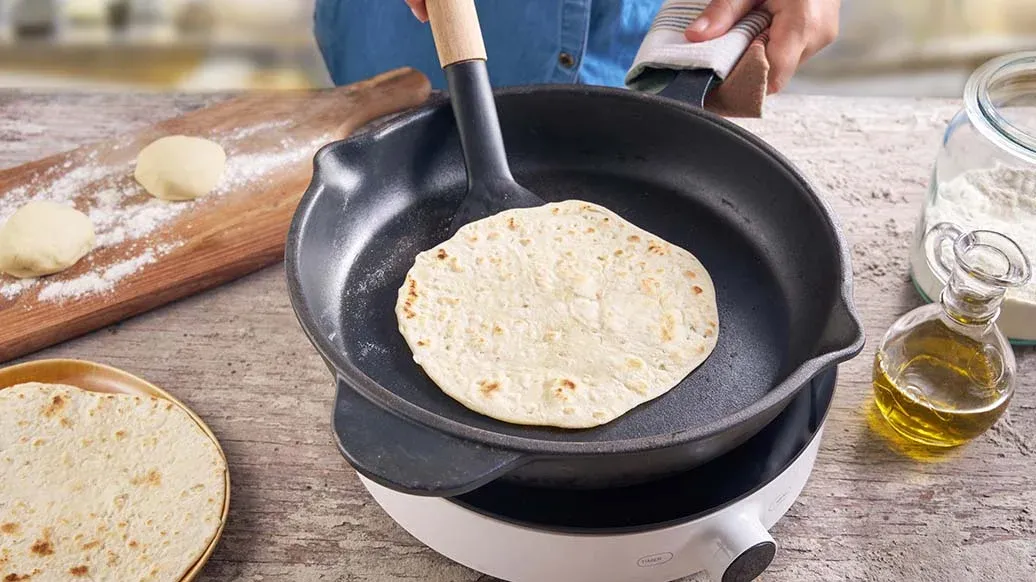 Knoblauch mit Olivenöl vermischen. Warmes Wasser nach und nach zu 150 g Weizenmehl geben und vermengen, dann das Knoblauchöl hinzufügen. Den Teig ca. 5 Minuten kneten, bis er glatt und elastisch ist. In einer mit einem feuchten Tuch oder Frischhaltefolie abgedeckten Schüssel 20 Minuten ruhen lassen. In 4 Portionen teilen, zu Kugeln formen und dünn ausrollen, dabei mit den restlichen 20 g Mehl bestäuben. Eine Pfanne ohne Fett bei mittlerer bis hoher Temperatur erhitzen und jedes Chapati pro Seite 20 bis 30 Sekunden backen, bis goldene Blasen und Röstspuren entstehen.