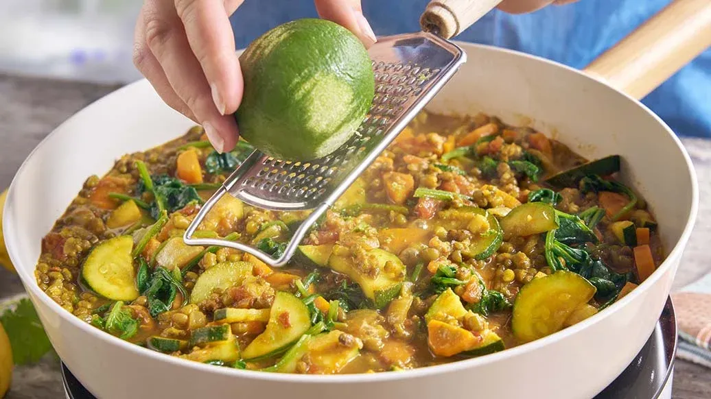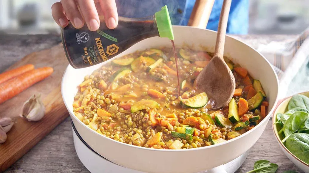 Ein aromatisches Dal aus grünen Mungbohnen mit Spinat, Karotten und Tomaten, verfeinert mit Zitrone, Limettenschale und Kikkoman salzreduzierter Sojasauce. Leicht, cremig und würzig durch frischen Koriander.