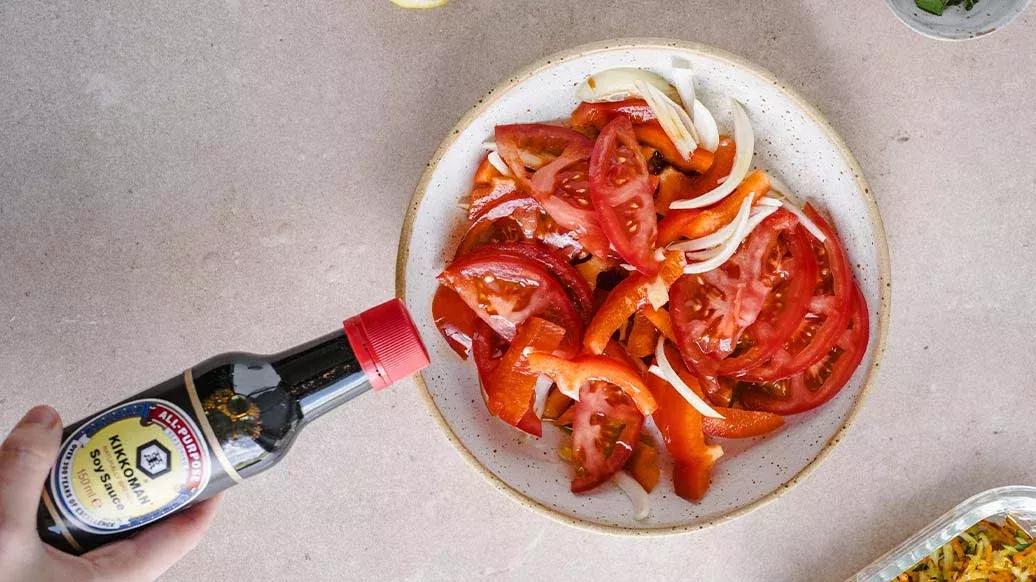 Paprika, Tomate und Zwiebel in Scheiben schneiden und mit Kikkoman Sojasauce, Olivenöl und Zitronensaft vermischen. Sauce zu den Pfannkuchen servieren.