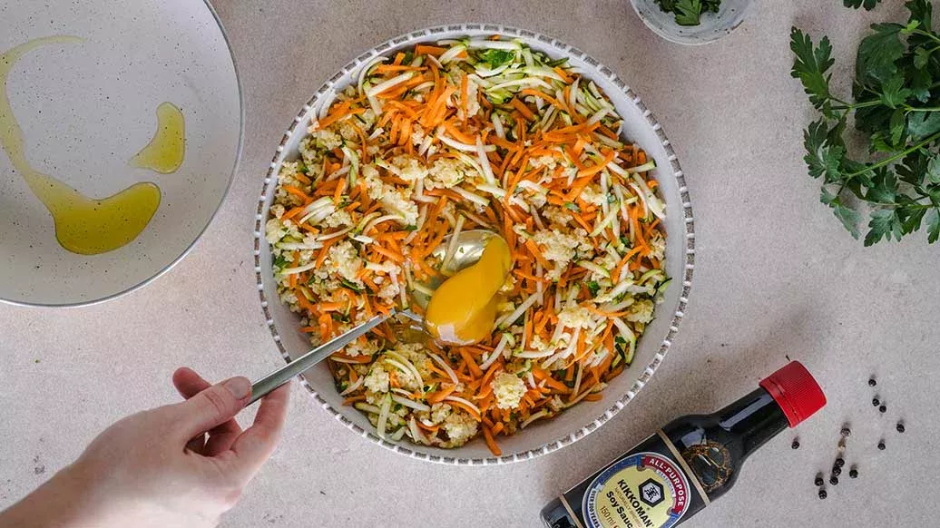 100 g gekochte Hirse – ¼ Zucchini – 1 Karotte – 1 Ei – ½ TL Pfeffer – 1 EL gehackte Petersilie – 2 EL Olivenöl